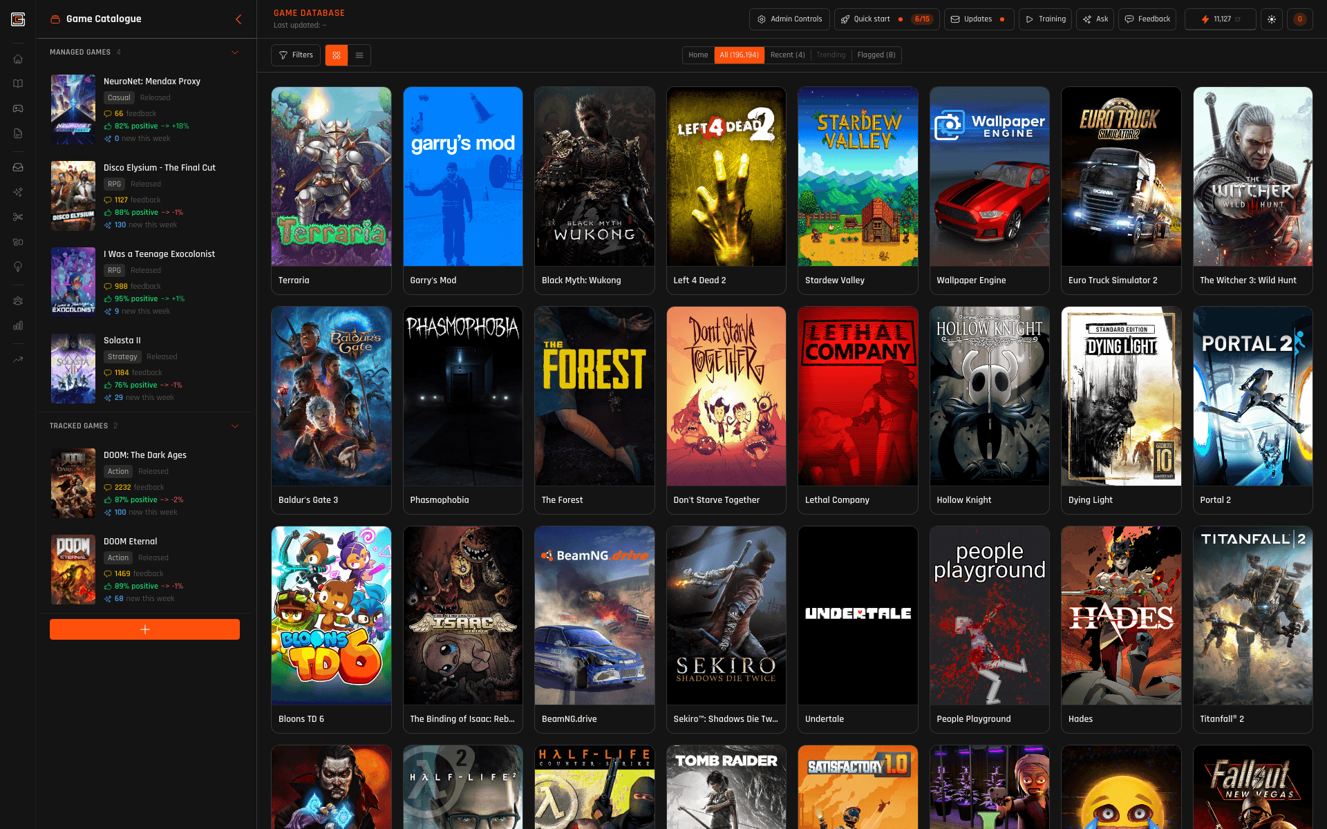 Browse Steam; your workspace catalogue is what you’ve added for work — that turns on tracking and Cores per title. Quick Analyze from browse; deeper workflows once the game is in workspace.