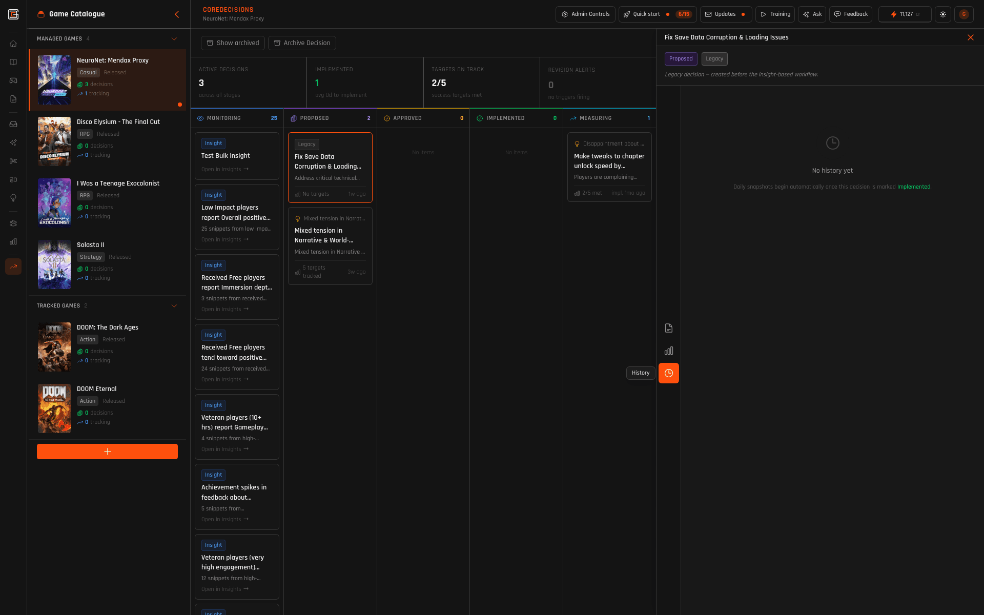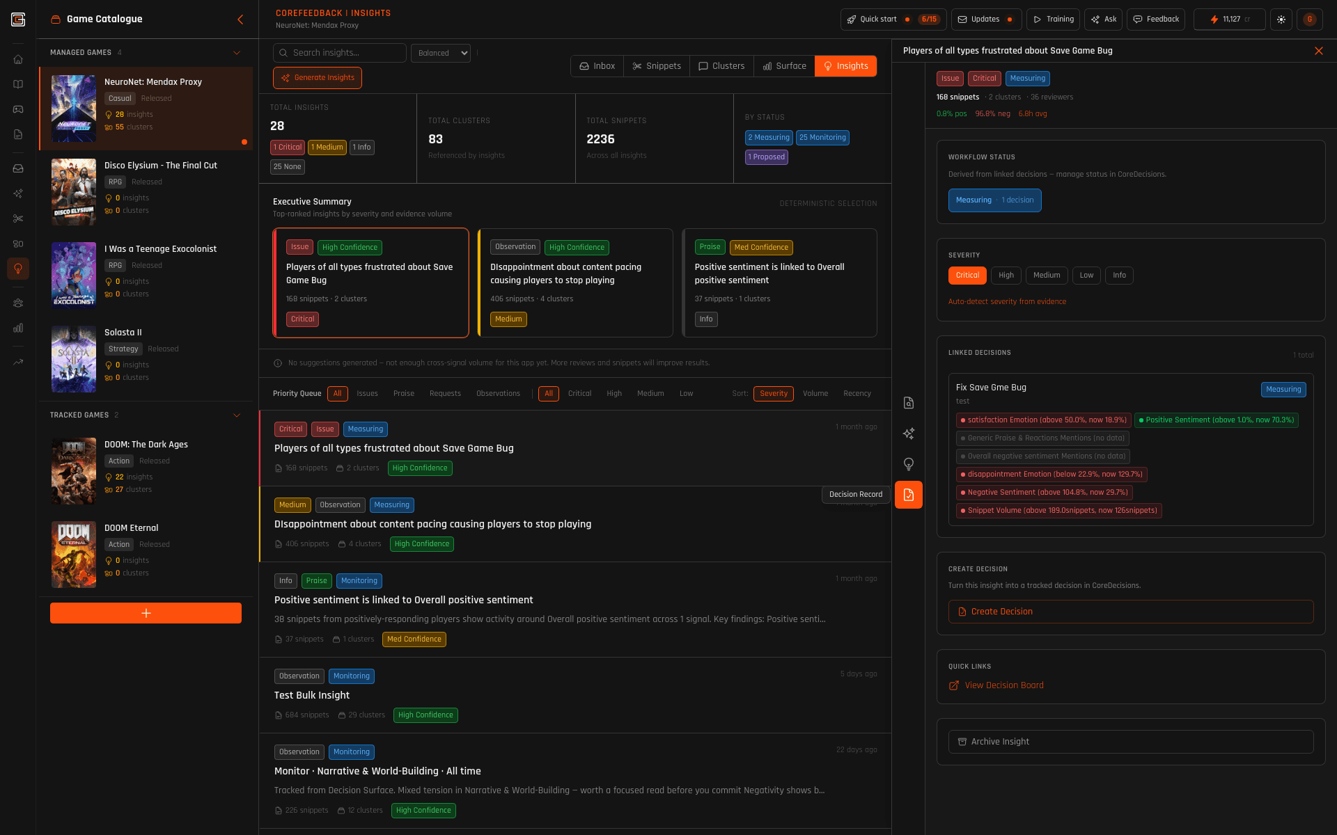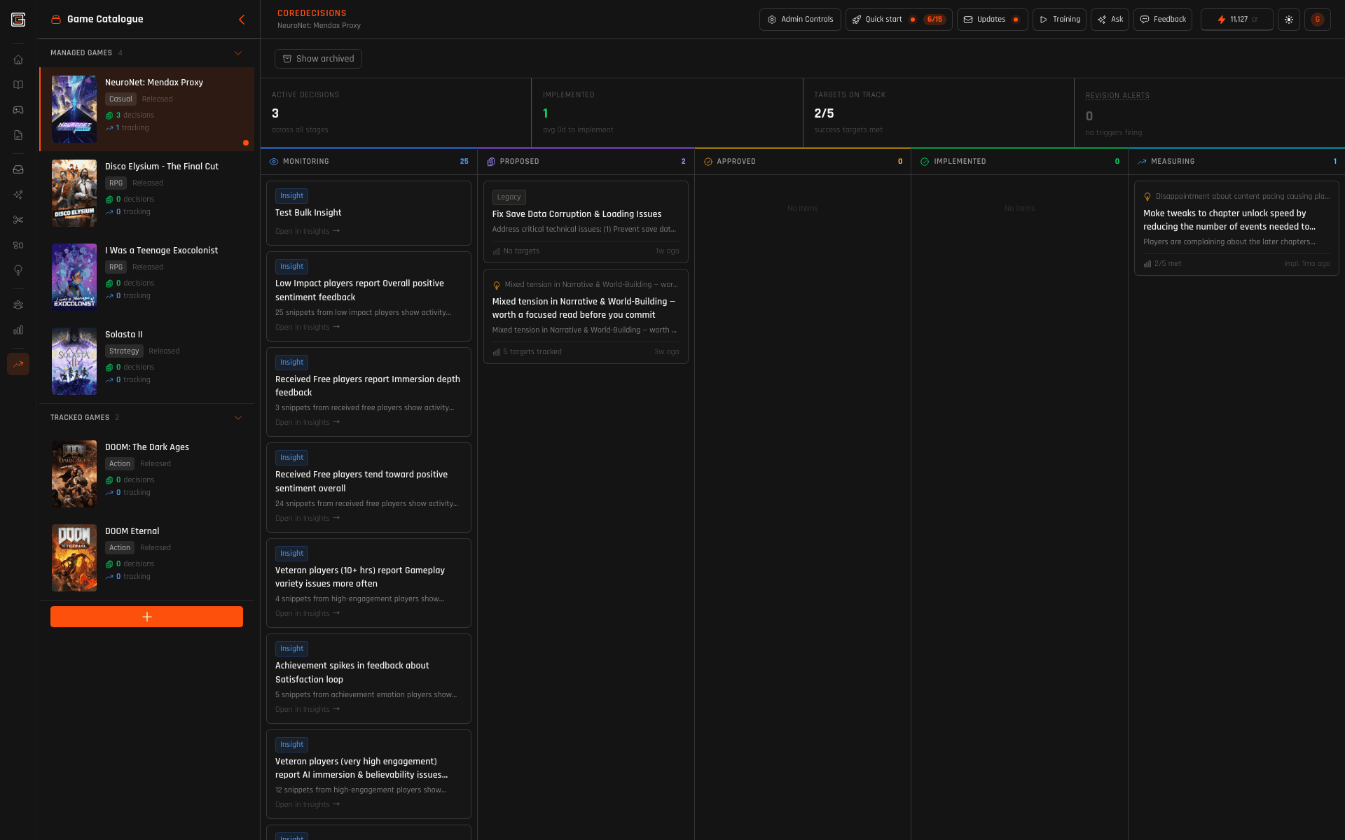 You ship a live-ops change and attach four automated daily metrics (e.g. recommendation rate, vitriol share, volume on an “economy” cluster, refund-mention signal). While that decision sits in Implemented / Measuring, metering runs at 1 credit per metric per day — about 4 credits/day (~120 over 30 days) for that decision, before any manual edits or one-off report runs. When the window ends, the record still shows what you believed, what you measured, and how the curves moved — so the next room argues from the same evidence chain.