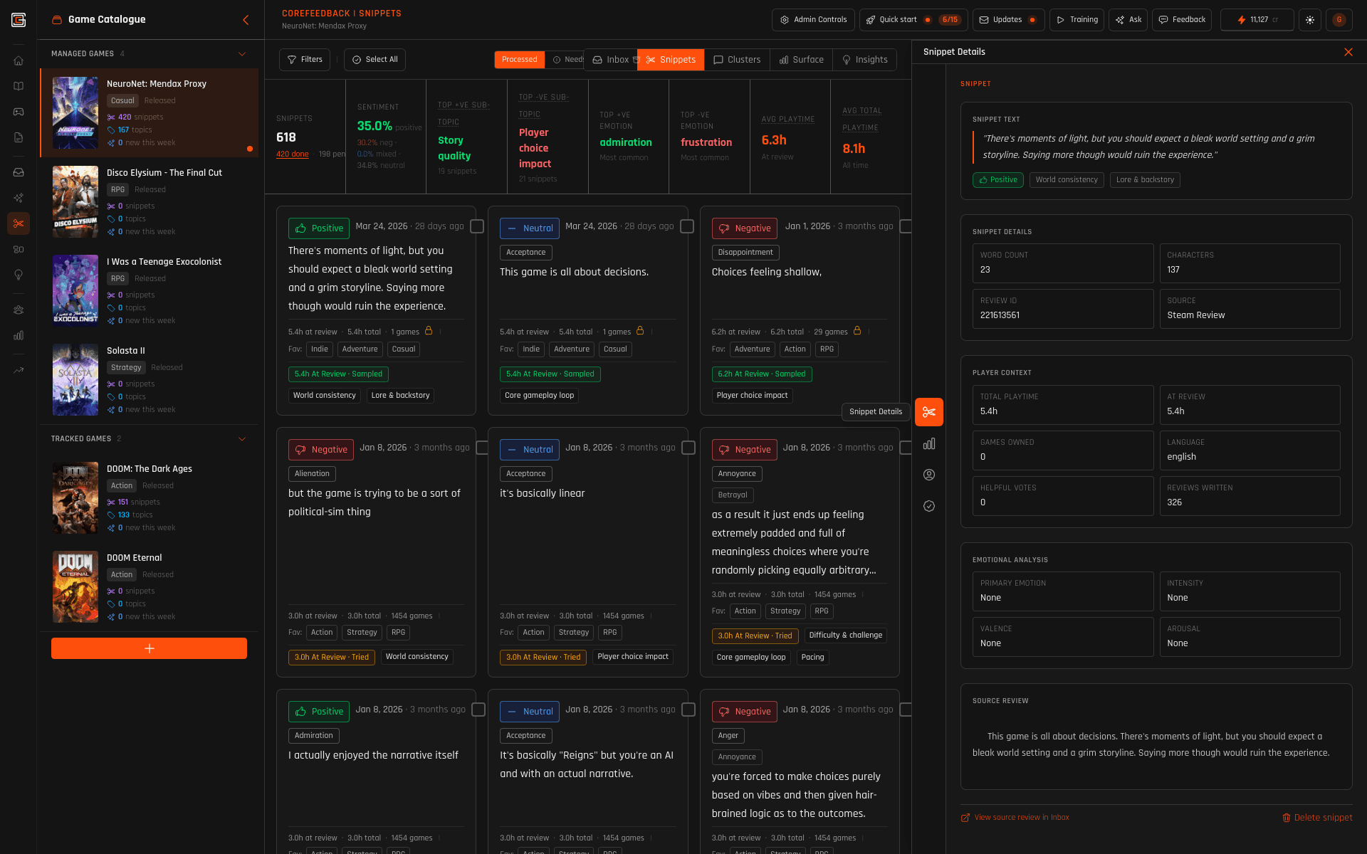 Snippets are quotable, classifiable units — so claims are checkable. Longer reviews → more snippets → higher classification cost than one-liners; taxonomy-driven NLP (not generative slop). Credits on successful classification only; manual work doesn't spend credits.