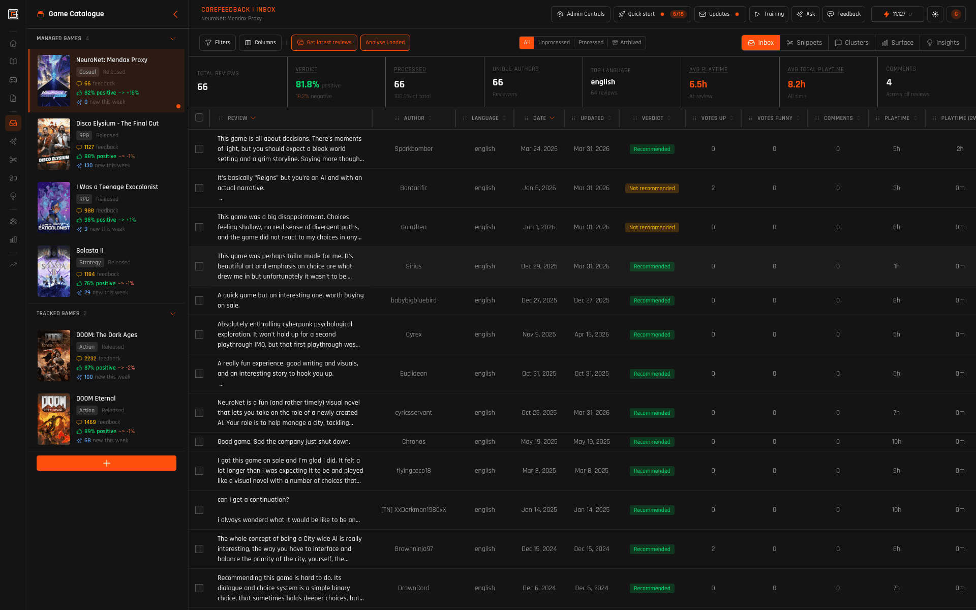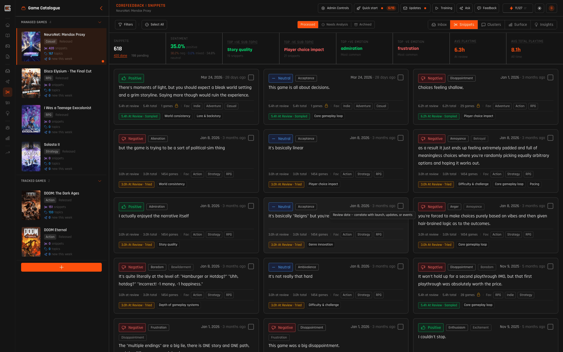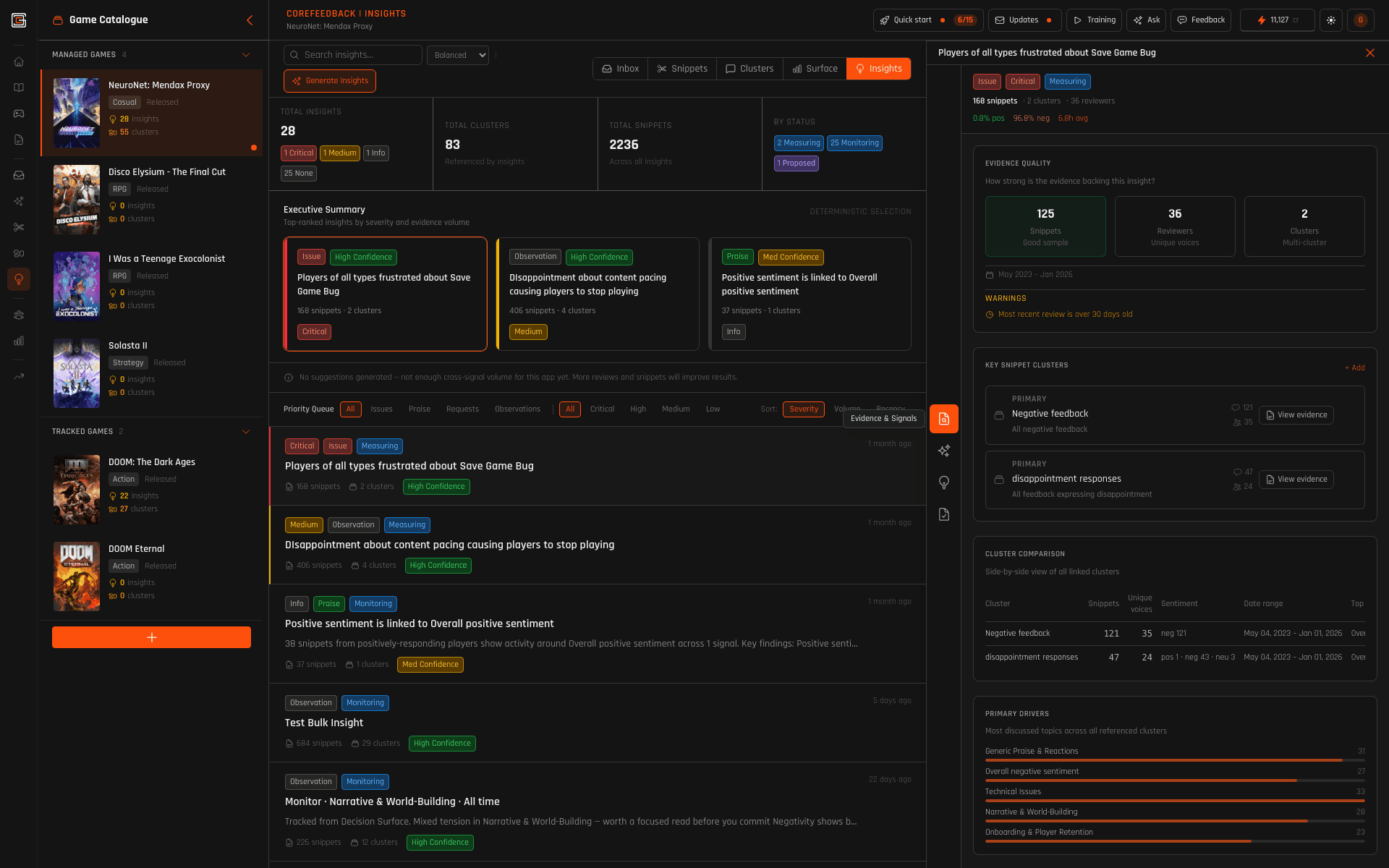Player voice → structured snippets, clusters, and insights you can accept or reject.