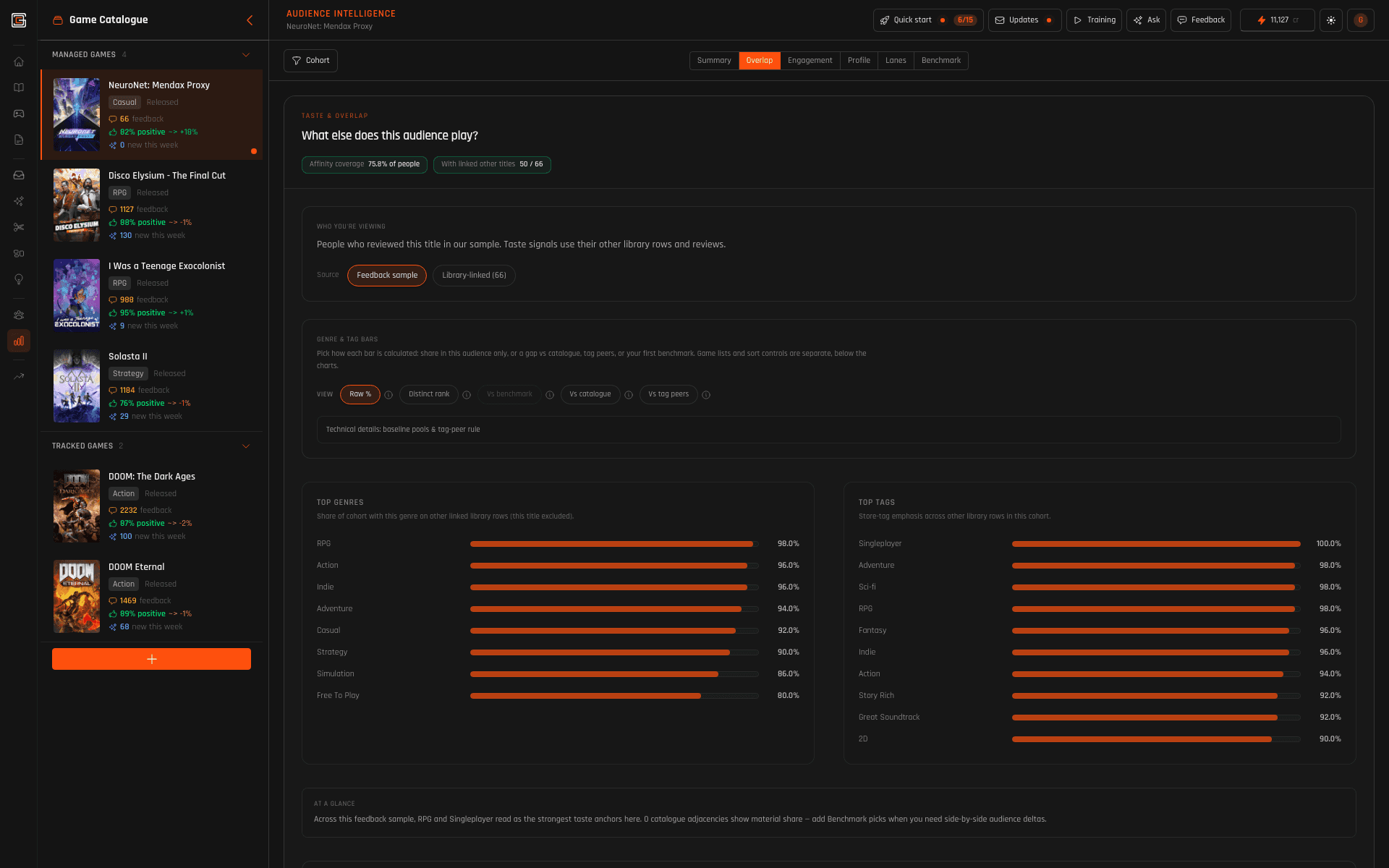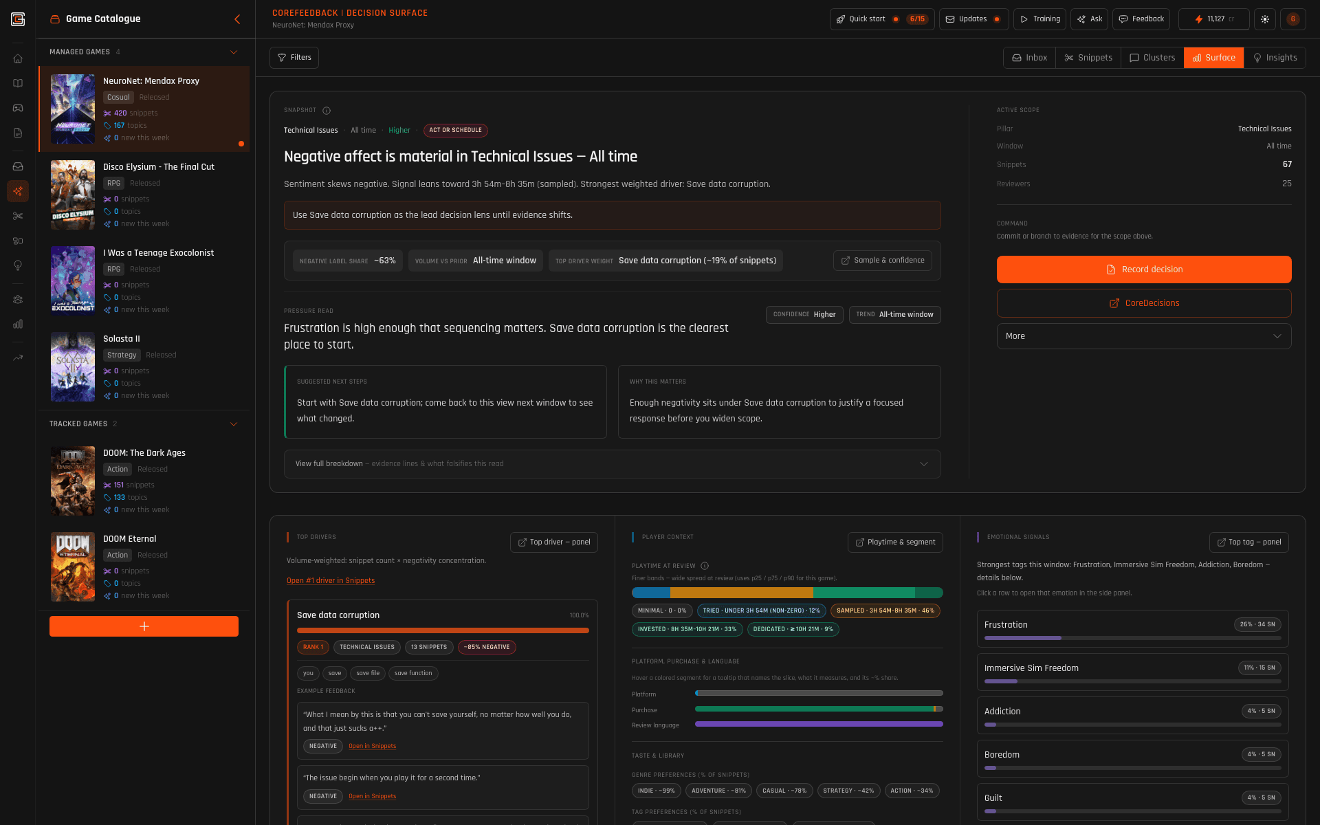 Real players leave real signals. In their reviews, their behaviour, their community discussions, their silence. Most of it goes unread, is misunderstood, or gets reduced to a score. GameDataCore surfaces what players are actually experiencing: their emotions, motivations, frustrations, and loyalties. Not as sentiment data, but as structured, attributable intelligence your whole team can reason from and act on.