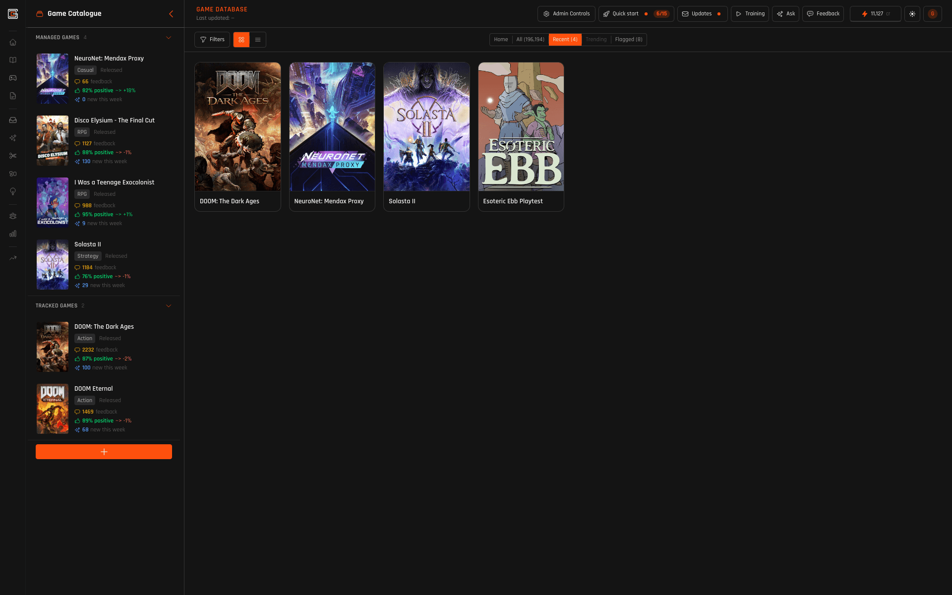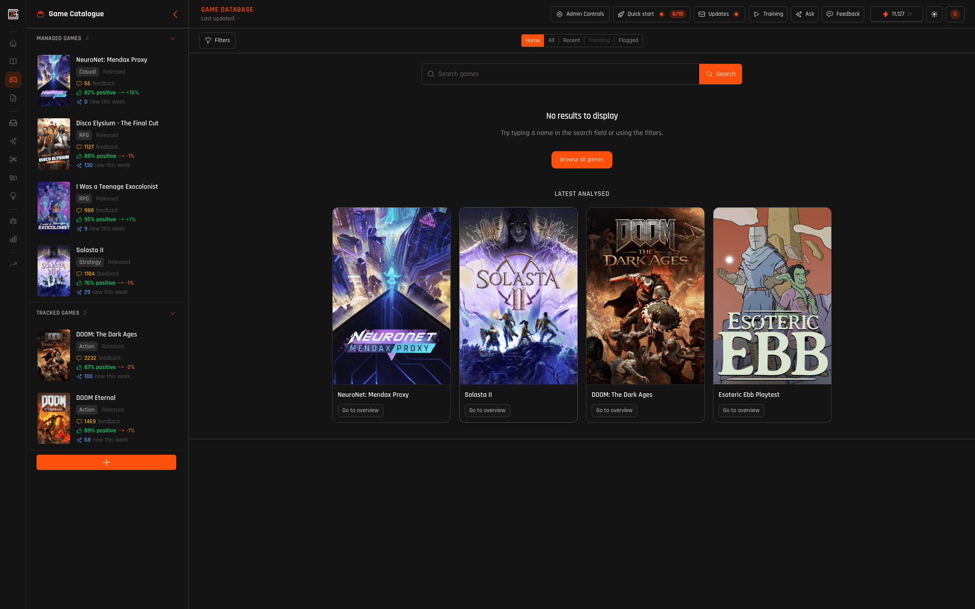 Browse Steam; your workspace catalogue is what you’ve added for work — that turns on tracking and Cores per title. Quick Analyze from browse; deeper workflows once the game is in workspace.