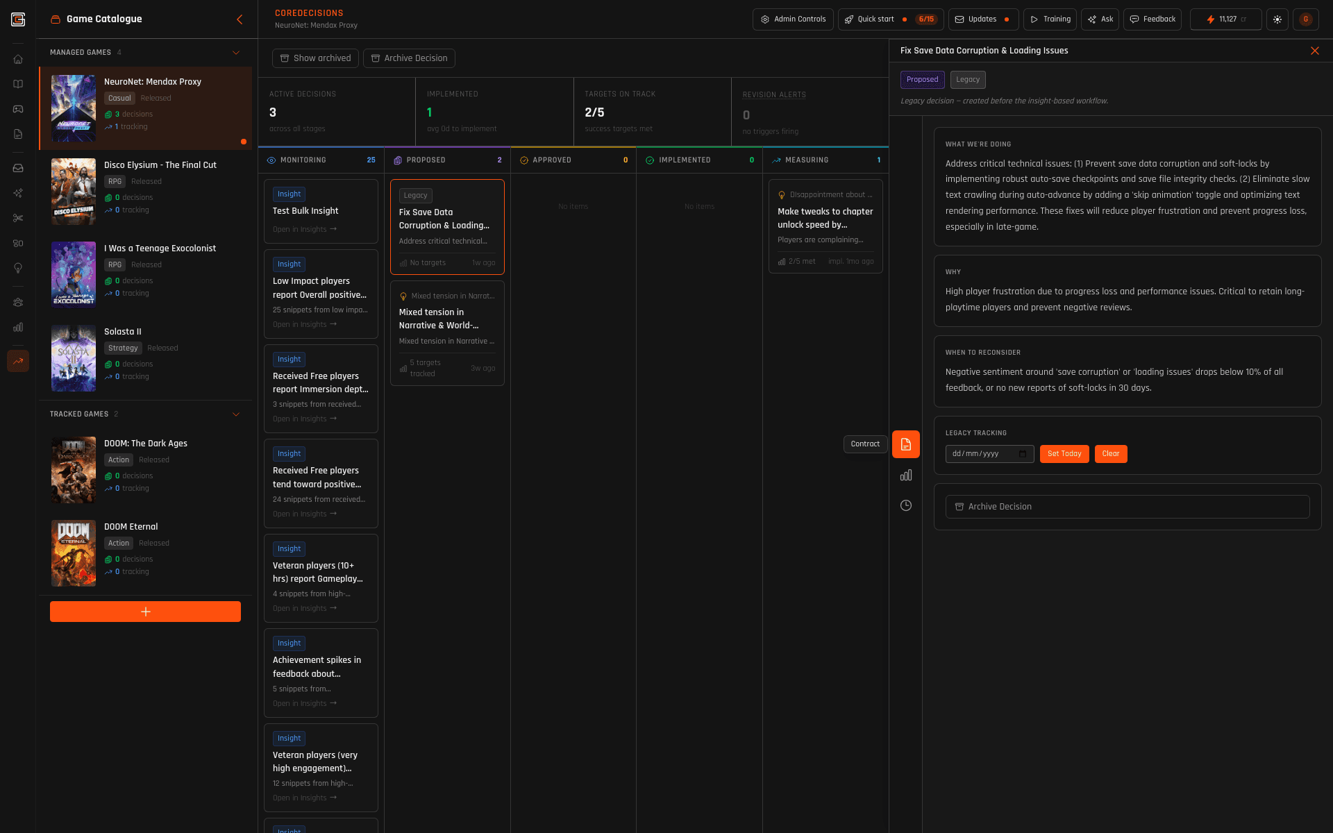 You ship a live-ops change and attach four automated daily metrics (e.g. recommendation rate, vitriol share, volume on an “economy” cluster, refund-mention signal). While that decision sits in Implemented / Measuring, metering runs at 1 credit per metric per day — about 4 credits/day (~120 over 30 days) for that decision, before any manual edits or one-off report runs. When the window ends, the record still shows what you believed, what you measured, and how the curves moved — so the next room argues from the same evidence chain.